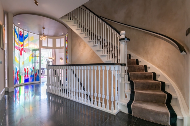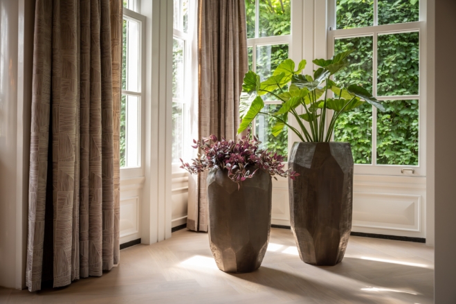 Samen met enkele bestaande elementen, zoals het gekleurde glas en een Belgisch hardstenen vloer in het trappenhuis, is dit als uitgangspunt gekozen voor het gehele nieuwe interieur. Vervolgens is deze omvangrijke metamorfose ruimte voor ruimte aangepakt, rekening houdend met alle originele kenmerken van de woning.