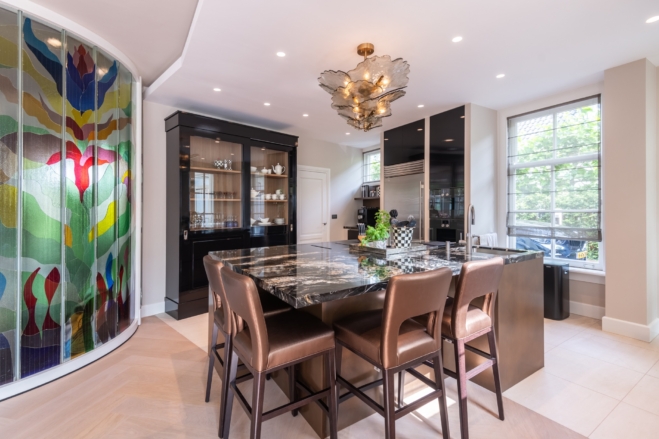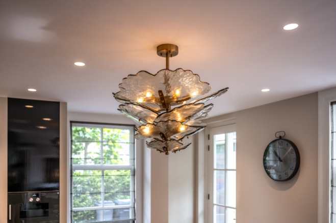 Er is überhaupt flink uitgepakt met verlichting; boven het kookeiland hangt een heel fraai exemplaar met bladeren van glas, net als de ‘Martini’ boven de eettafel waar de ornamenten van zowel helder glas als amberkleurig glas – geïnspireerd op de smeltende ijsblokjes in een Martini on the rocks – matchen met de stoffering van de stoelen.